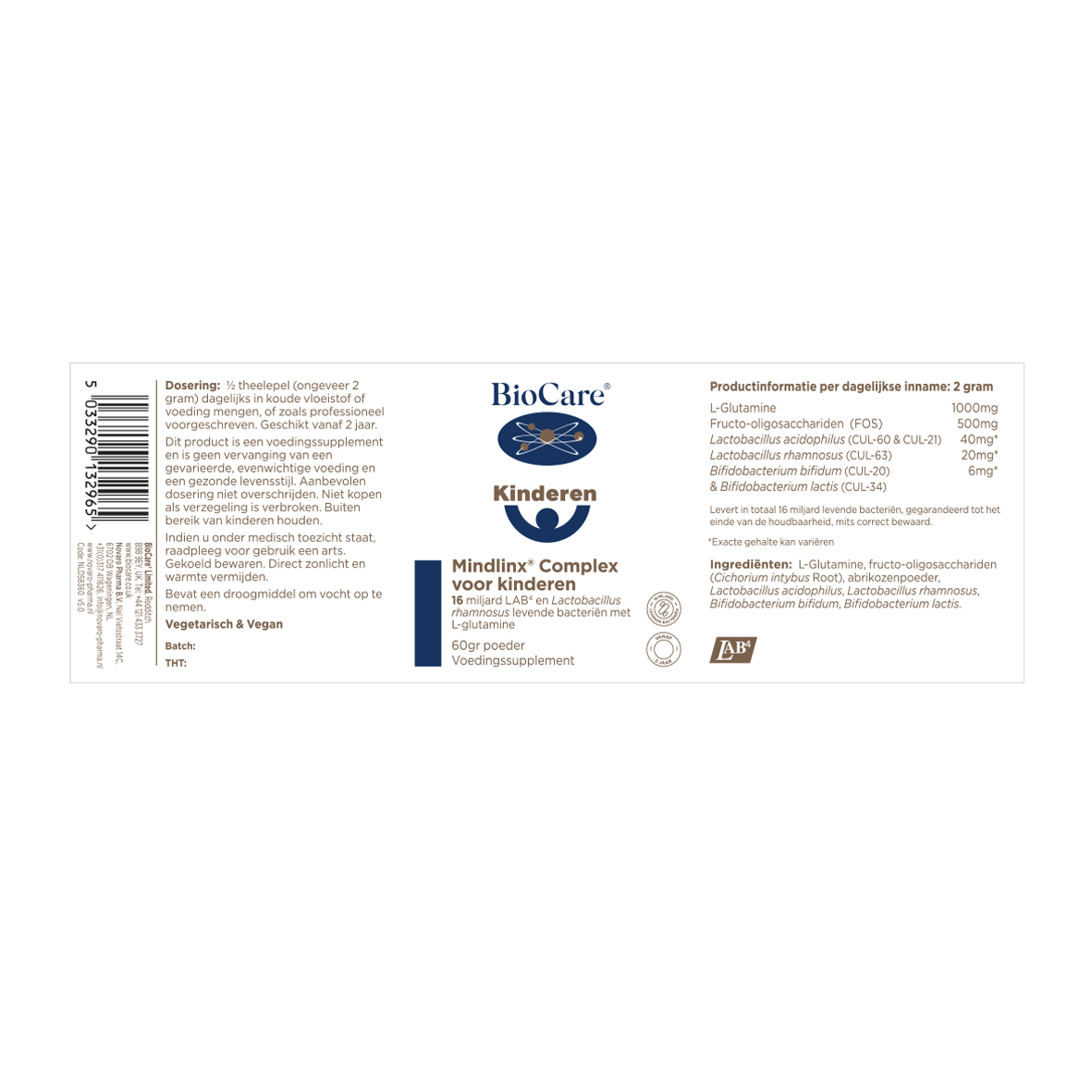 Mindlinx® Complex voor kinderen is een unieke mix van de klinisch onderzochte LAB4 en Lactobacillus rhamnosus levende bacteriën met L-glutamine.