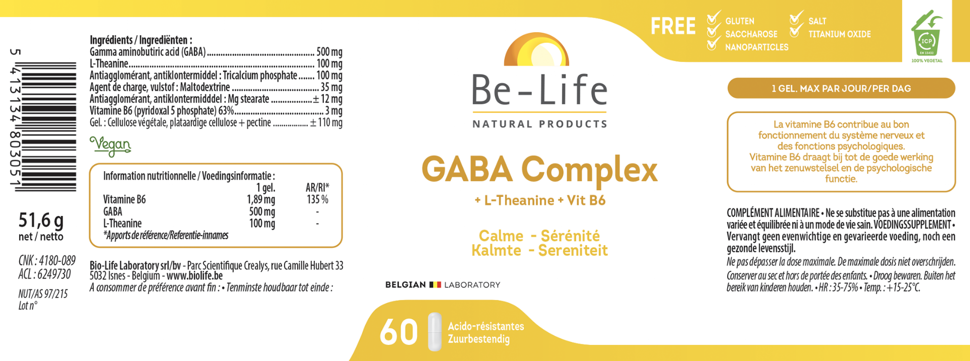 G-aminobutirzuur (GABA), L-Theanine non-GMO, Vitamine B6 (pyridoxal 5 fosfaat), plantaardige capsule
