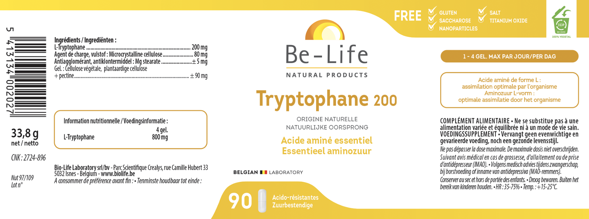 L-Tryptofaan, niet-GGO, Microkristallijne cellulose, Magnesium stearaat, Plantaardige cellulose (capsule)