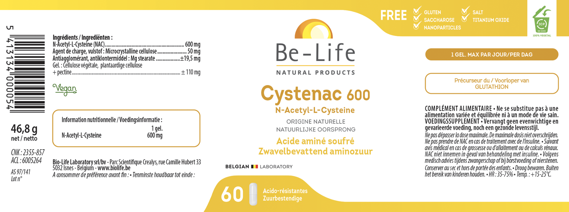 N-Acetyl-L-Cysteïne (NAC), niet-GGO, Microkristallijne cellulose, Magnesium stearaat, Plantaardige cellulose (capsule)