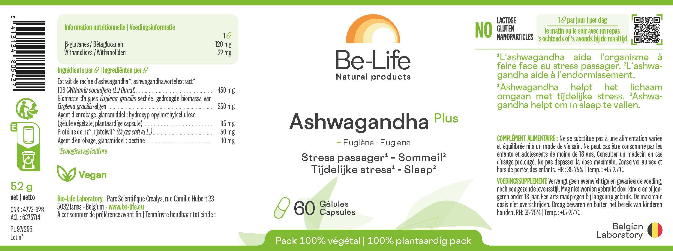 Ashwagandha Plus combineert ashwagandha, een adaptogene plant uit India, met euglena, een microalg die bekendstaat als superfood.
