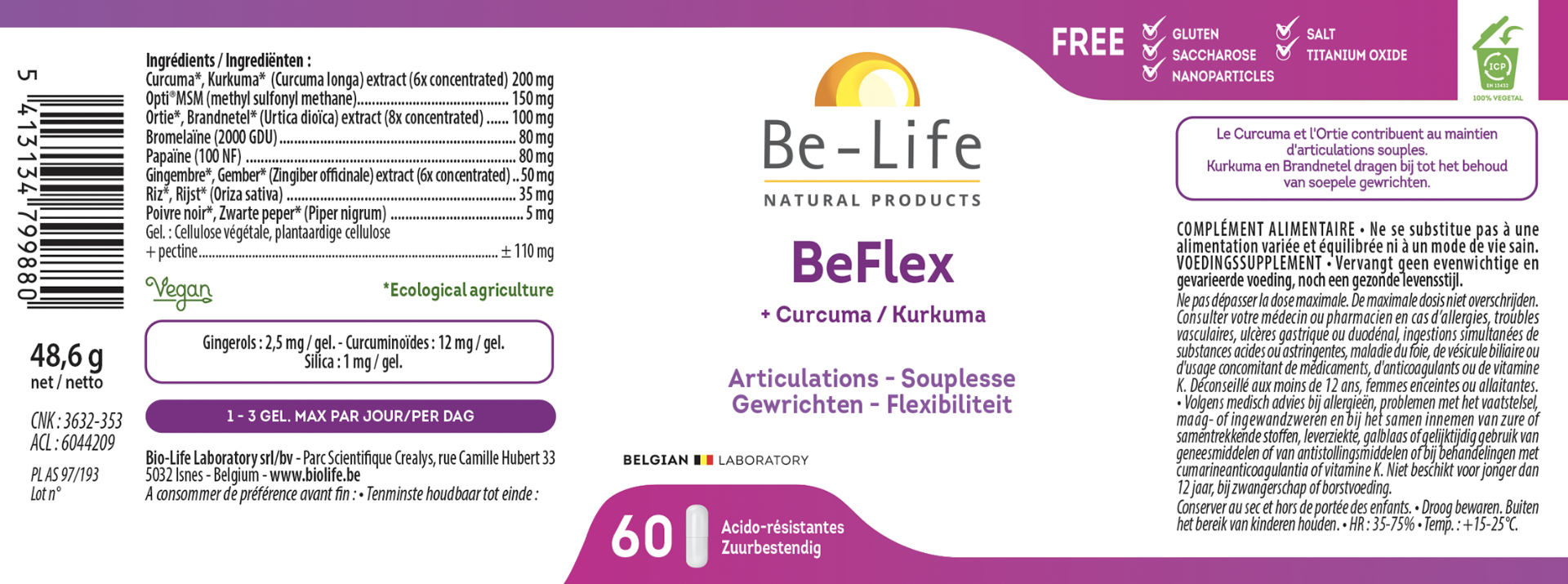 Curcuma (Curcuma longa) 6x geconcentr. extract bio, Opti®MSM (methyl sulfonyl methaan), Brandnetel (Urtica dioïca) 8x geconcentr. extract bio, Bromélaine (2000 GDU), Papaine (100 NF), Gember (Zingiber officinale) 6x geconcentr. extract bio, Zwarte peper (Piper nigrum) bio