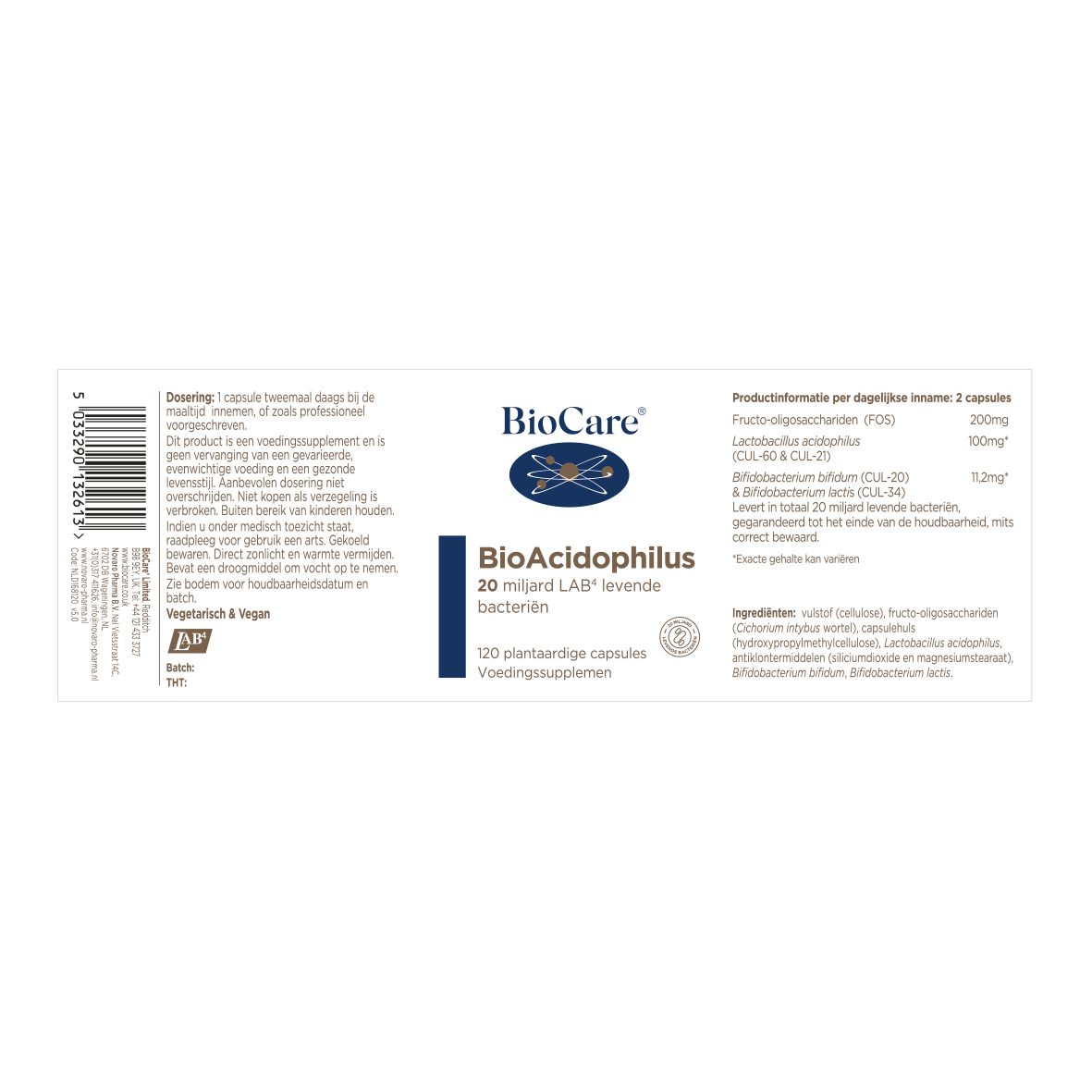 BioAcidophilus is een mix van het unieke, klinisch onderzochte LAB4-complex van levende bacteriën voor dagelijks gebruik. Geen onnodige toevoegingen en zuivelvrij.