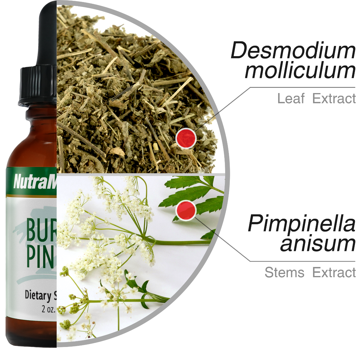 Extractiemiddel (ethanol en mineraal water), extract van het blad van de burbur (Desmodium molliculum) en pinella (pimpinella anisum) steel.