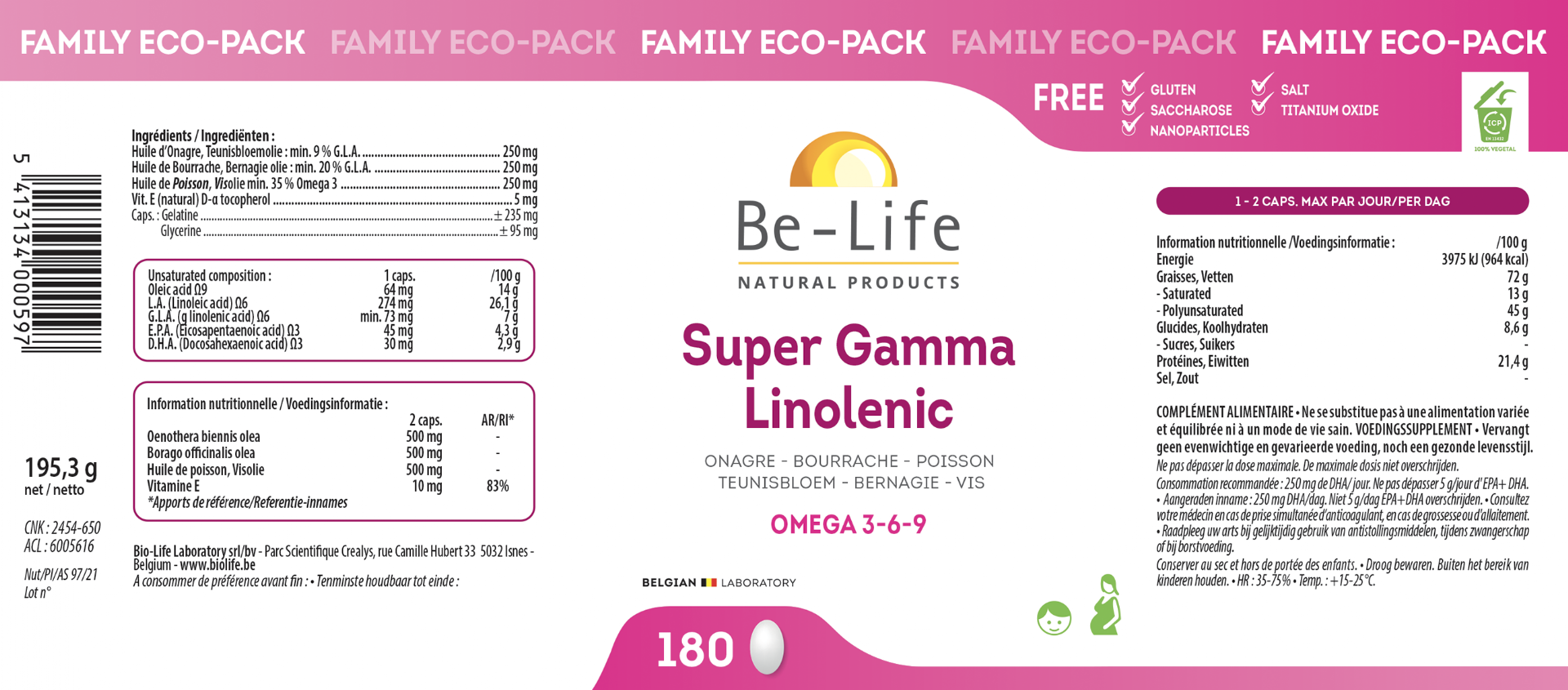 Teunisbloemolie van 1ste koude persing, Bernagie-olie van 1ste koude persing, VISOLIE*, Vitamine E (natuurlijke D-alfa tocoferol), Capsule met gelatine en glycerine