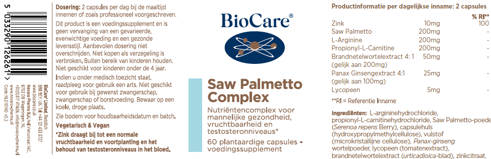 L-argininehydrochloride, propionyl-L-carnitinehydrochloride, Saw Palmetto Powder (Serenoa repens Berry), capsulehuls (HPMC), vulstof (microkristallijne cellulose), Panax Ginseng wortelpoeder, lycopeen (tomatenextract), brandnetelwortel extract (Urtica dioica blad), zinkcitraat.