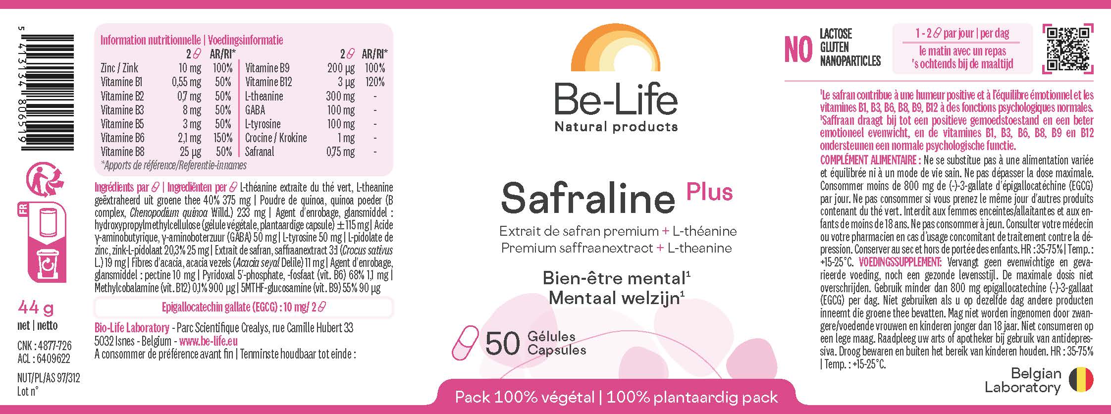 Safraline Plus is een synergie van planten (saffraan, groene thee, quinoapoeder...), vitamines, aminozuren en mineralen (zink).