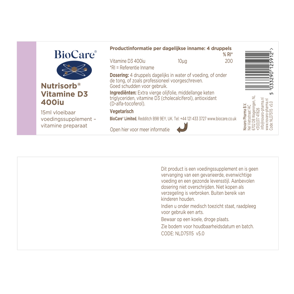 Optimaal geabsorbeerde vloeistof met 400 IE vitamine D3 per dagelijkse dosis, die kan worden verhoogd of verlaagd om aan individuele behoeften te voldoen.