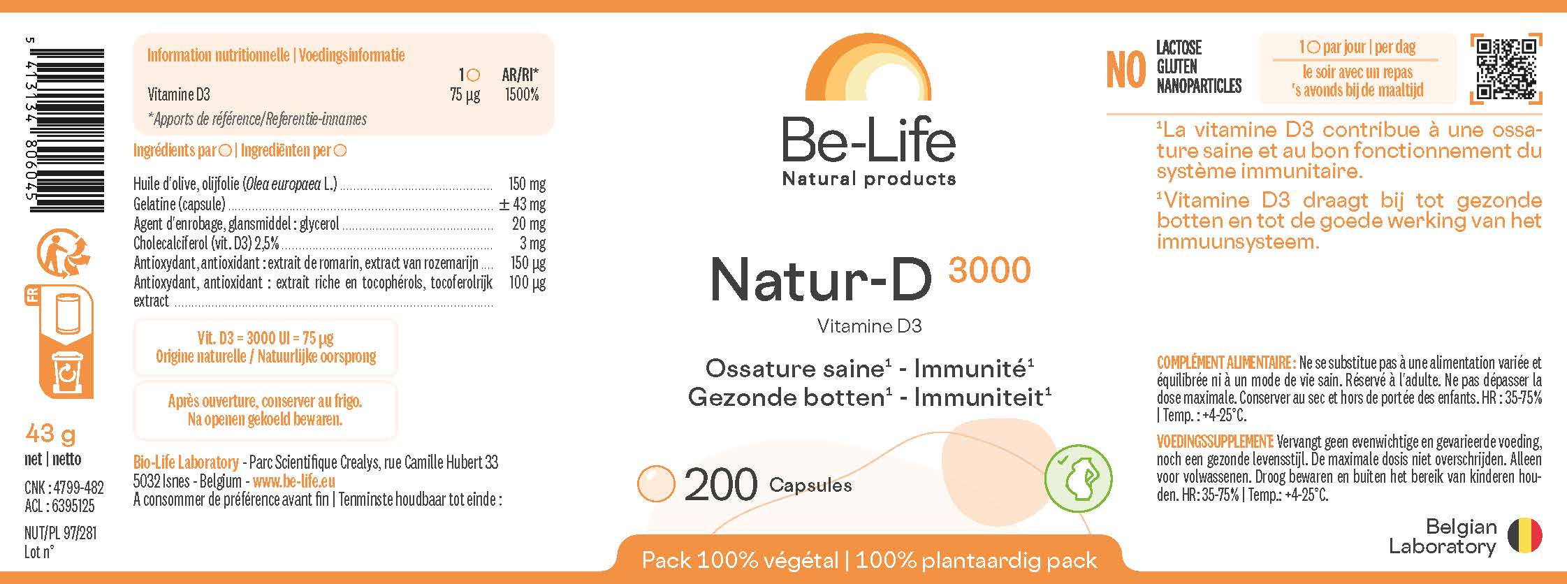 De formule van Natur-D 3000 bevat natuurlijke vitamine D (wordt beter gemetaboliseerd dan de synthetische vitamine D2) voor een betere opname door het lichaam.